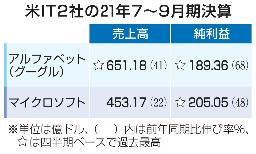 【ニューヨーク共同】米グーグルの持ち株会社アルファベットとマイクロソフト(MS)が26日発表した2021年7〜9月期決算は、純利益が共に四半期ベースで過去最高を更新した。グーグルは広告収入が増加し、MSはクラウドサービスが伸びた。新型コロナウイルス禍による社会のデジタル化浸透で、成長が続いた。