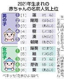 ベネッセは2日、今年1〜9月に生まれた赤ちゃんの名前の調査結果を発表した。最多は、男の子が4年連続で蓮(れん=主な読み方)、女の子が同数で陽葵(ひまり)と紬(つむぎ)だった。同社は「新型コロナウイルスの影響が続く中、変化や目新しさより、堅実さや安心感のある名前が選ばれる傾向が強い」と分析している。
