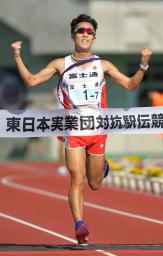 東日本実業団対抗駅伝は3日、埼玉県の熊谷スポーツ文化公園陸上競技場および公園内特設周回コースの7区間、76・4キロで行われ、富士通が3時間40分4秒で2年連続4度目の優勝を果たした。1秒差の2位でたすきを受けた最終7区の横手健が残り約1キロでホンダの設楽悠太をかわした。
