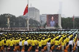 7月、中国共産党創建100年を記念する祝賀大会で大型スクリーンに映し出された党総書記の習近平国家主席と掲揚される国旗=北京の天安門広場(共同)