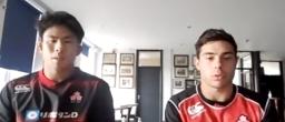 オンラインで記者会見するラグビー日本代表のライリー(右)と徳永=5日