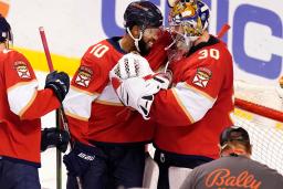 ハリケーンズに勝利して喜ぶパンサーズのGKナイト(右)、FWデュクレアら=サンライズ(AP=共同)