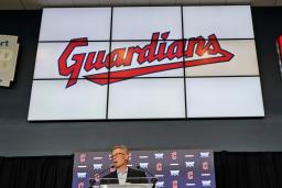 7月、新名称の「ガーディアンズ」のロゴを掲げ、記者会見するインディアンスのドラン・オーナー(AP=共同)