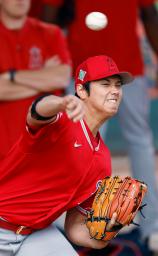 ブルペンで投球練習するエンゼルス・大谷=テンピ(共同)