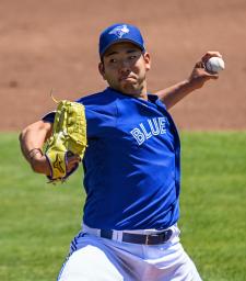 フィリーズ戦で投げるブルージェイズの菊池=27日、ダンイーデン(AP=共同)
