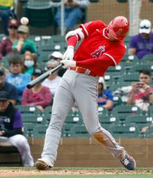 エンゼルスの大谷は「1番・指名打者」で出場し、2打数1安打2打点、2得点だった。七回に代打を送られた。内容は二ゴロ、四球、左越え本塁打(打点2)。チームは8―2で勝った。(共同)